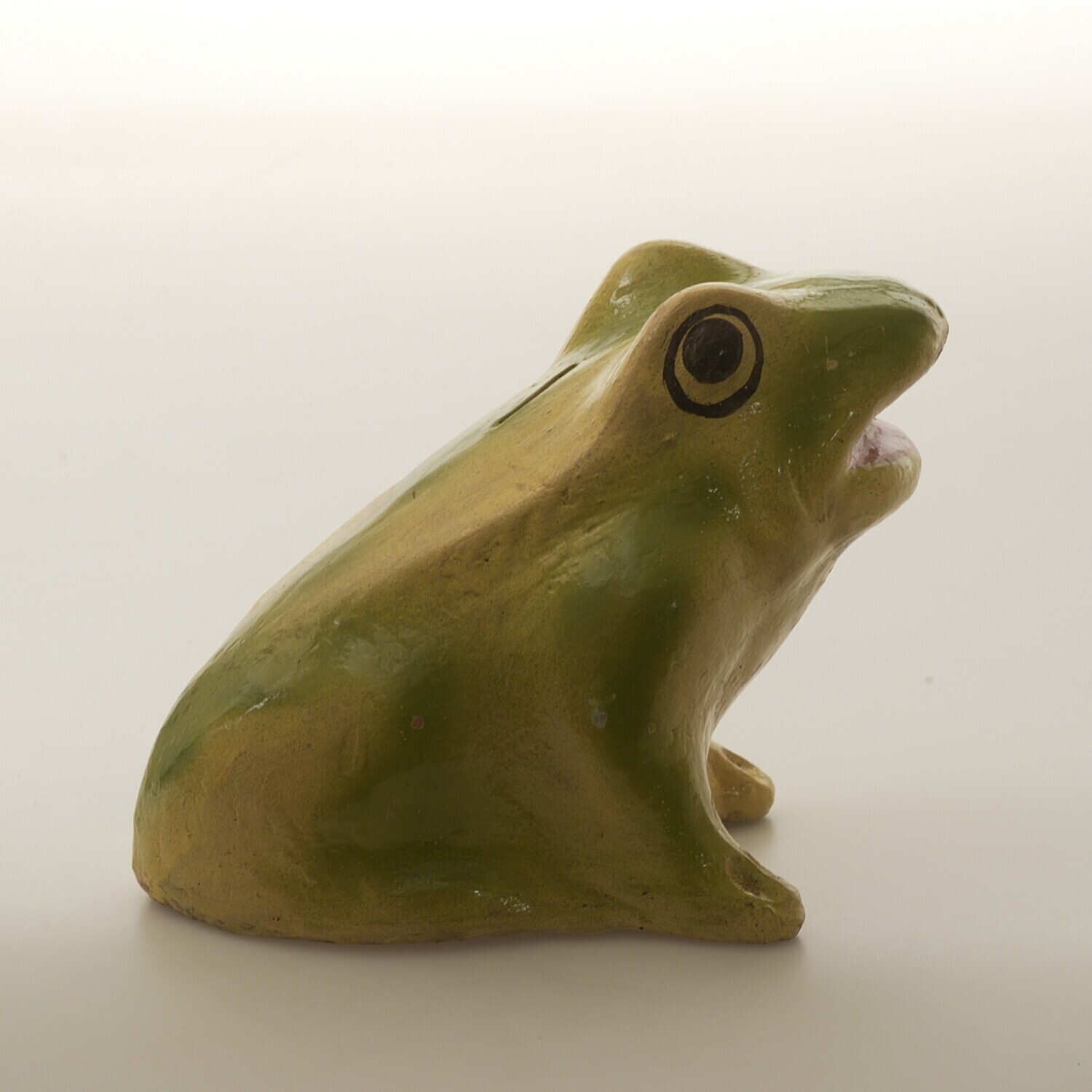 Beschilderde spaarpot van aardewerk in de vorm van een kikker (Nederlands)