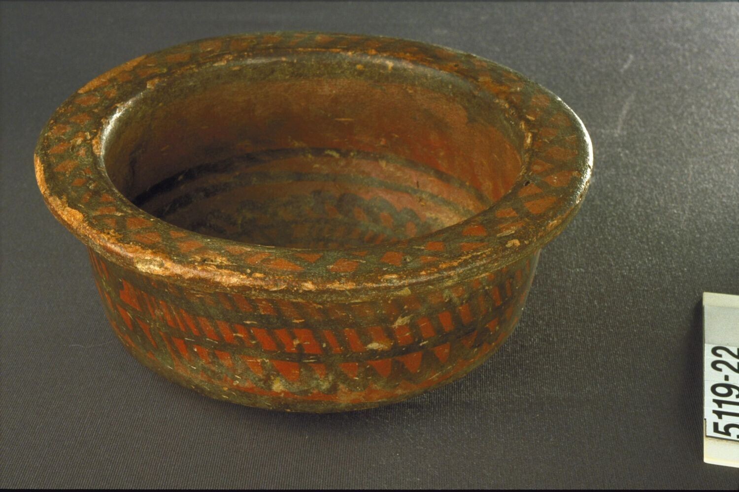 Aardewerken kom met beschilderde versieringen in golf- en kruislijnen, zowel aan de binnen- als de buitenkant (Nederlands)