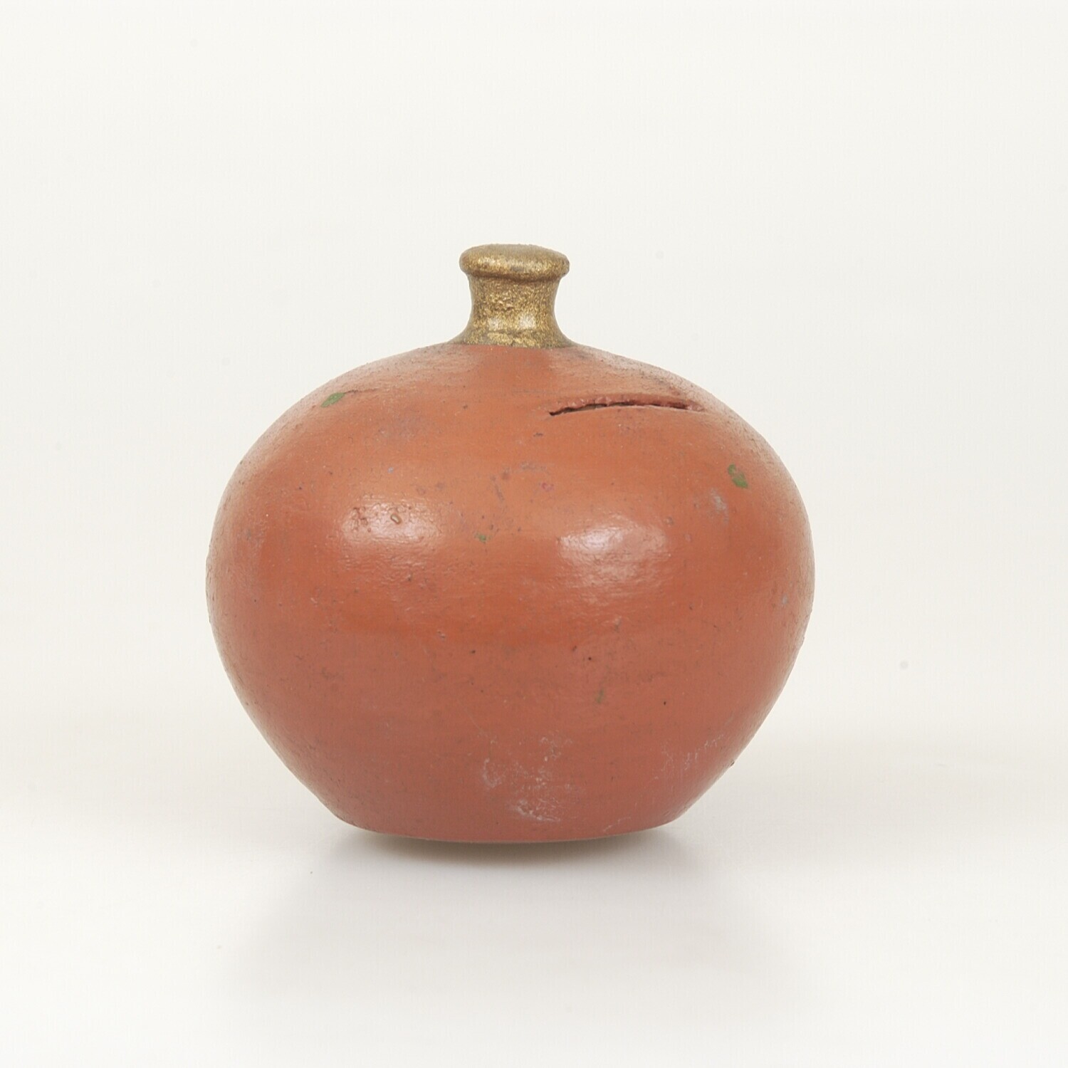 Beschilderde spaarpot van aardewerk in de vorm van een vrucht (Nederlands)