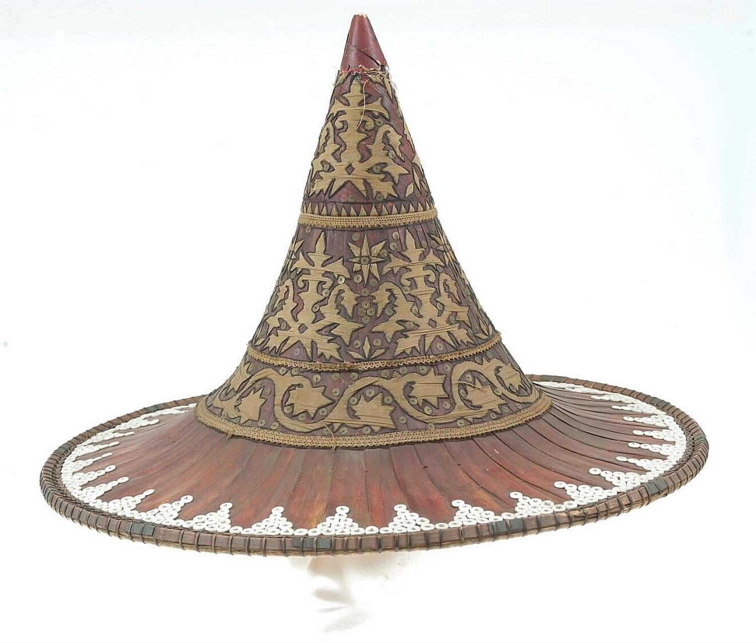 | Nederlands | Grote spits-kegelvormige hoed van gevlochten pandanblad met brede rand, versiering van wit porceleinen knoopjes |