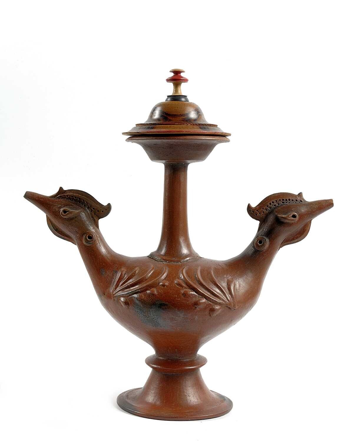 | Nederlands | Waterkruik van gebakken rode aarde met houten deksel |