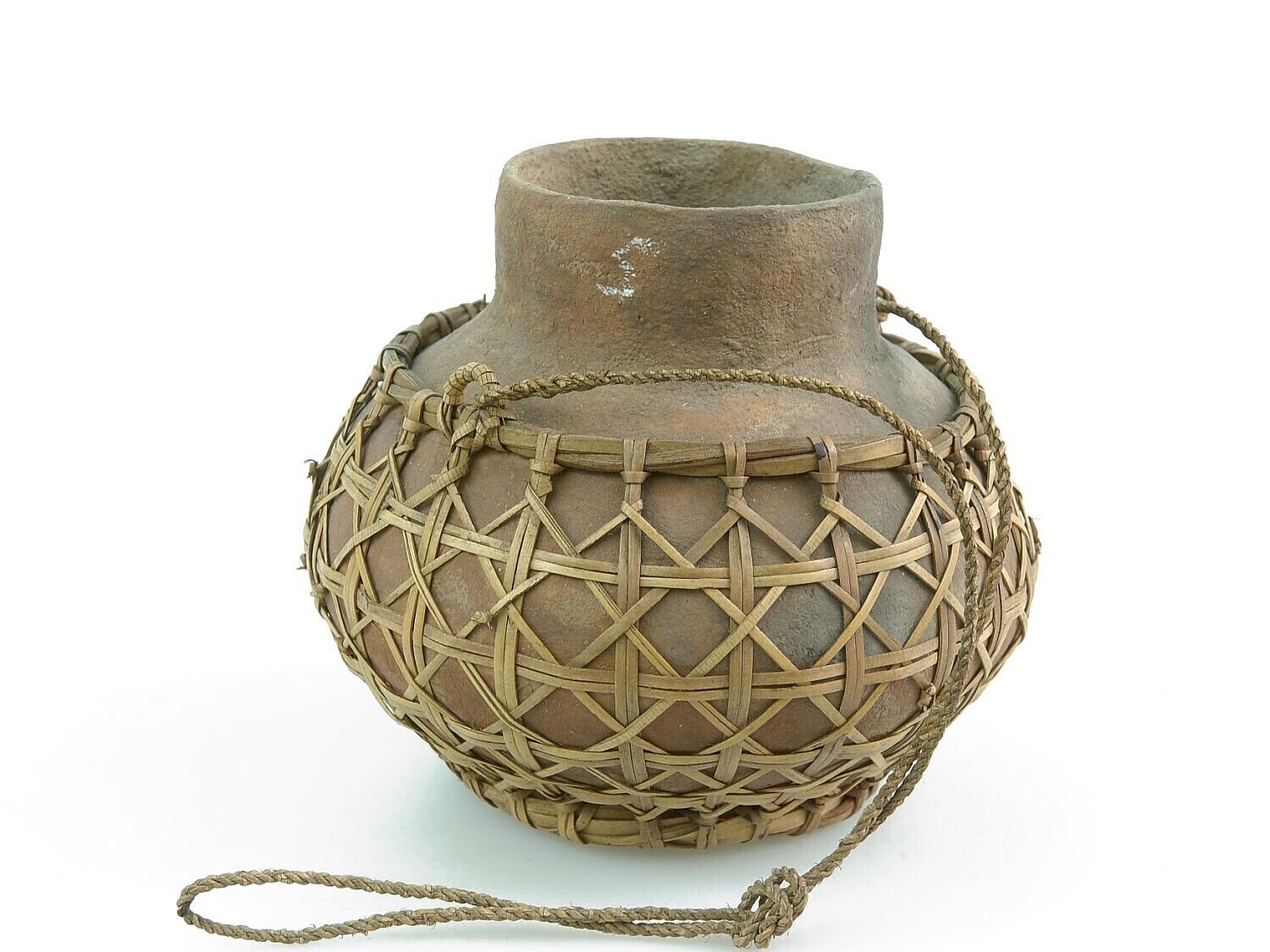 Aardewerken potje in een omvlechting van rotan (Q34759)