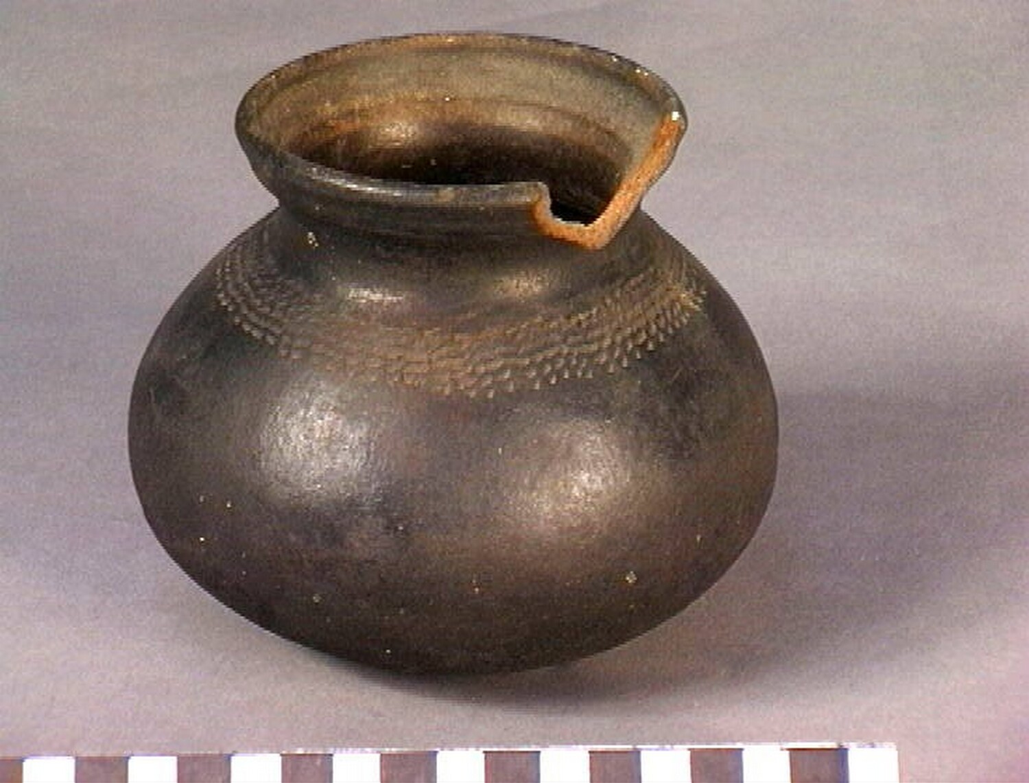 Aardewerken kookpot met rond de hals een versiering van ingeprikte puntjes (Nederlands)