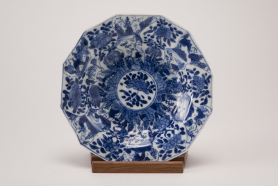 Een twaalf kantig diep schoteltje op standring met op de buitenzijde twaalf blauwe bloemen met stelen en bladeren. Op de binnenzijde twaalf naar binnen lopende punten die om en om beschilderd zijn met bloemen en landschapjes. In het midden op het plat, in blauw, een cirkel met daarin een bloem. (Nederlands)