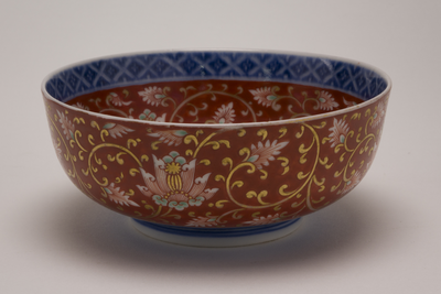 Kom op standring met op de buitenzijde goudkleurige en groene bloemdecoraties op een roodbruine ondergrond. Aan de standring rondom blauwe onderglazuurdecoratie. Op de binnenzijde idem met blauwe decotatie een de bovenrand. (Nederlands)