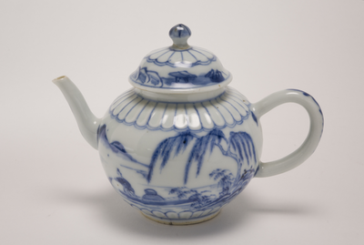 Theepotje op standring mer oor, schuin tuitje en deksen met knopje. Aan de boven en onderzijde zijn rondom kleine lobben met blauwe lijnen aangebracht. Hiertussen een blauwe decoratie van een landschap met visser in een roeibootje. (Nederlands)