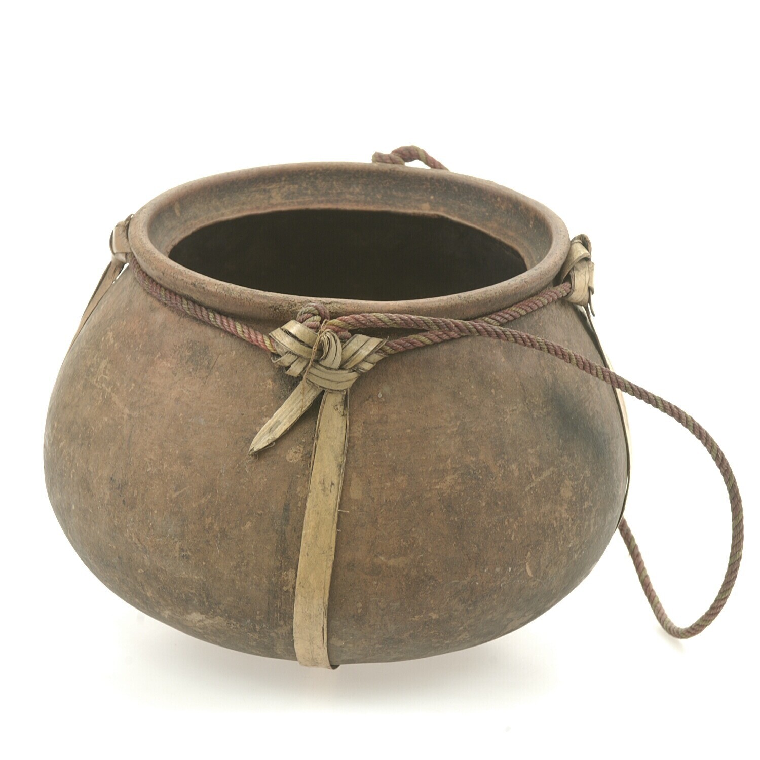 | Nederlands | Aardewerken pot met bijbehorende vezelring van plantenvezels |