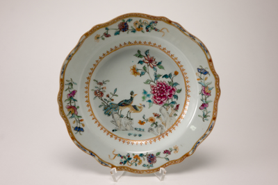 Diep grijs wit bord met gegolfde rand. Op het plat twee vogels en diverse bloemtakken. Hieromheen een goudkleurige sierrand. Op de rand vier bloemversieringen. Op de lip een band met vier versieringen. (Nederlands)