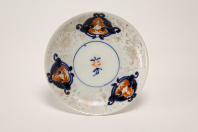 Wit schoteltje met hierop drie donkerblauwe met oranje versieringen met daartussen en op het plat bloemversieringen.