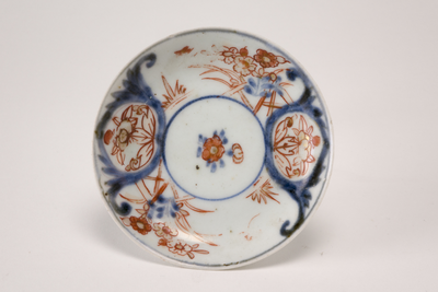 Wit schoteltje met hierop twee donkerblauwe met oranje versieringen met daartussen en op het plat bloemversieringen.