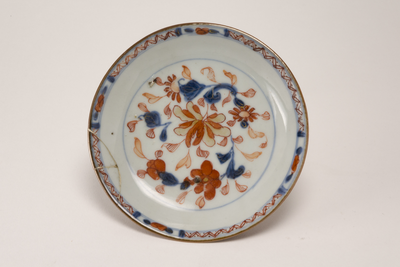 Cafe au lait schoteltje met op de buitenzijde een donkerbruine glazuur. Aan de binnenzijde langs de rand een blauw oranje sierrand. Op het plat een blauw, oranje en goudkleurige bloemdecoratie. (Nederlands)