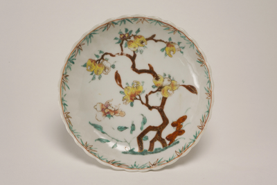 Gelobd schoteltje met gegolfde rand. Op het plat een bruine tak met gele citroenvrucht bloemen. Langs de rand bruine en groene bamboeblaadjes.