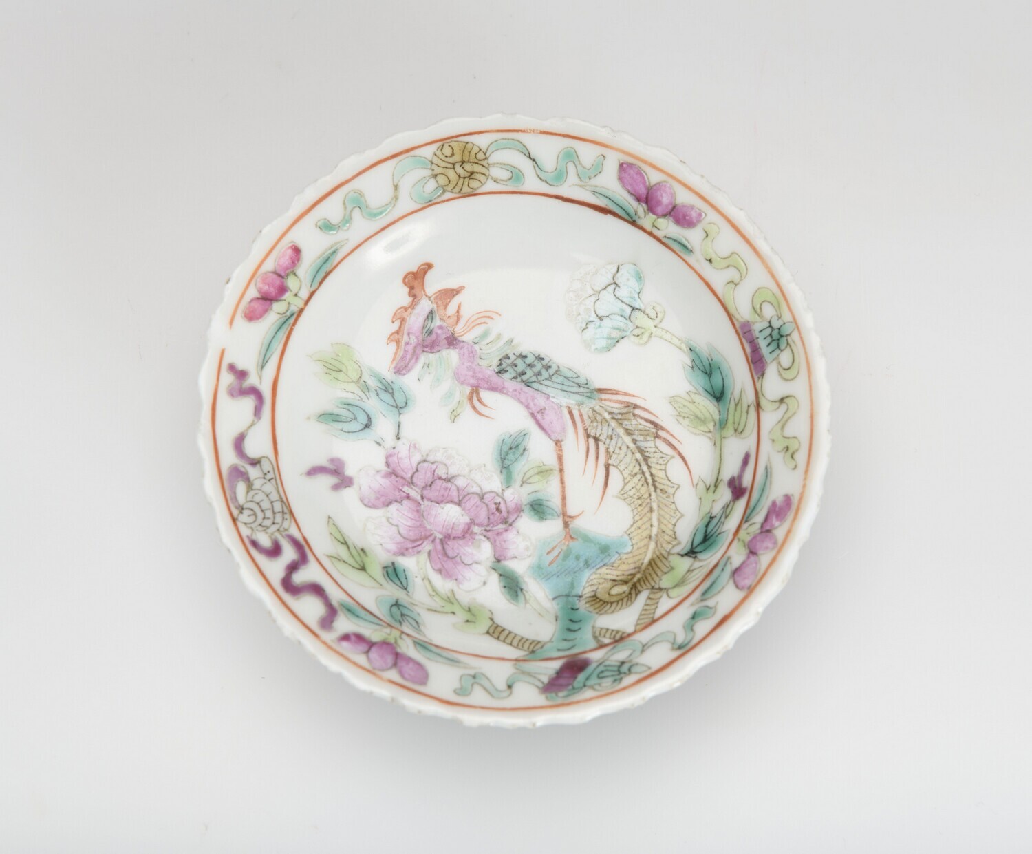 Porseleinen bord met een siervogel (pauw?) en bloemmotieven (Nederlands)