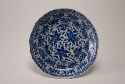 Blauw witte schotel met gegolfde rand en met drukbewerkte bloemversieringen op de binnenzijde.