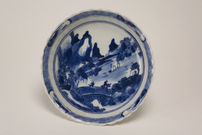 Blauw wit bordje met gegolfde rand. Op het plat een berglandschap met o.a.een stenen bruggetje met een persoon te paard, gevolgd door zijn bediende. Op de rand een blauwe band. (Nederlands)