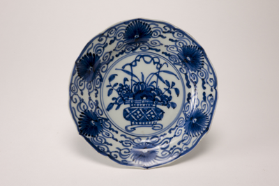 Blauw wit bordje met gegolfde rand en op het plat een hengselmand. Hieromheen, op de rand zes gestyleerde bloemen. (Nederlands)