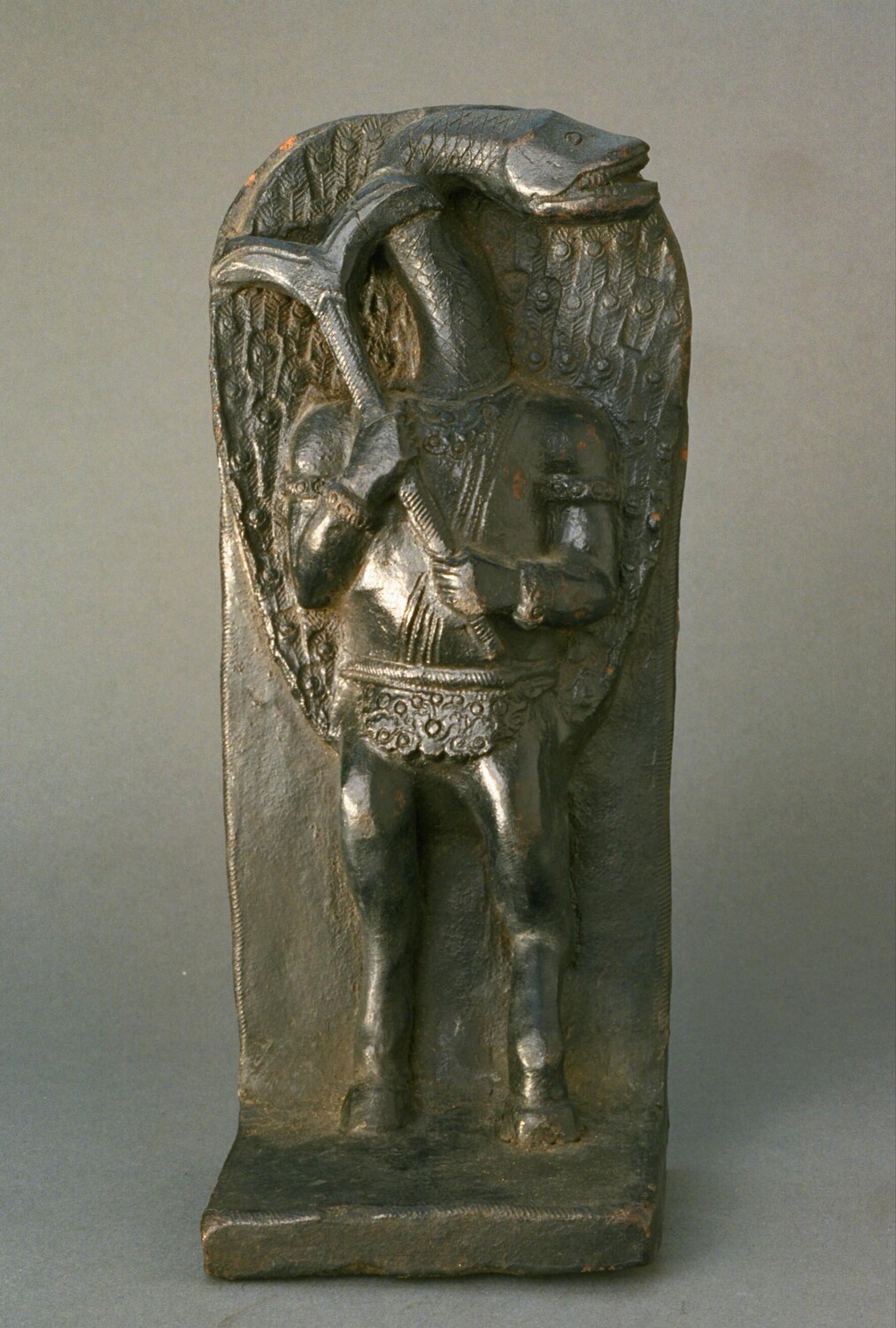 Fantasie Indo-Javaans beeld van zwart aardewerk, voorstellende een mens met slangenkop, pauwenstaart en hoeven (Nederlands)