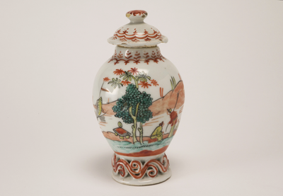 Bol theebusje op versierde voet met Delfts knopdekseltje. Op het deksel, de bovenrand en de voet een roodbruine versiering. Op de bus een landschapdecoratie met zeilbootje, bomen en personen. (Nederlands)