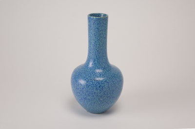 Bolvormig blauw met mintgroen (Robin`s egg glaze) vaasje met hoge smalle hals.