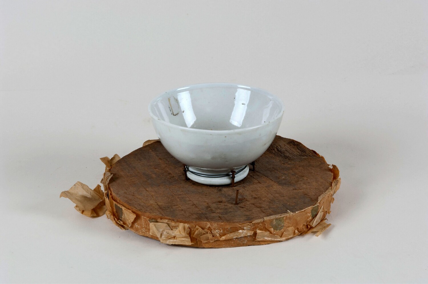Porseleinen kom op houten plank, behorende bij stervormige lampion (Nederlands)