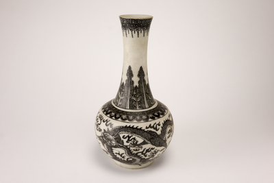 Knotsvormige biscuit fles met niet voldoende gebakken zwarte tekening van draken, wolken en golven. (Nederlands)