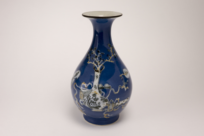 Flets blauwe vaas met hierop een vaasornament en takken in vlakreliëf gekleurd met zwart en bruin, Van Diepencollectie, JMD-P-0841 |
