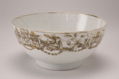 Kom op standring met verguld encre de Chine met hekwerk, daken, bloemen en pauwen. Op de binnenzijde de godin Juno (Hera).
