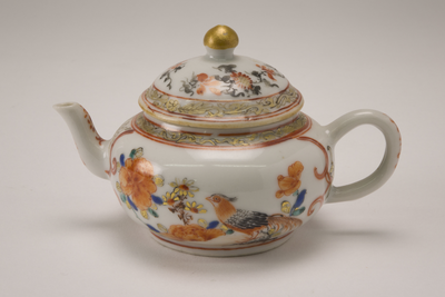 Klein bolvormig afgeplat Arita trekpotje met knopdekseltje. Langs de rande goudkleurige bloembanden. Op het deksel bloemversieringen in ijzerrood, zwart en goud. Op de buitnzijde twee catouches gevuld met bloemtakken en twee vogels(fazant?) in ijzerrood, zwart, blauw en goud. (Nederlands)