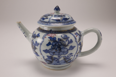 Theepotje met deksel met decoraties in goud, zwart en roze over blauwe onderglzuur.