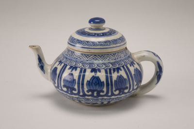 Pate tendre theepotje (etagère potje) met deksel. Met op het deksel en de pot diverse blauwe banden. Op de buik rondom velden met Lotusbloemknoppen in blauw.