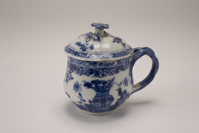 Blauw gedecoreerd wit kopje met gevlochten oor en knopdeksel, Van Diepencollectie, JMD-P-0860 |
