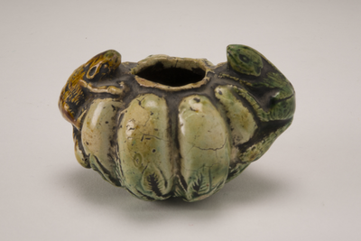 Groen met bruin (spinage and eggs) geglazuurde pompoen met op de rand twee kikkers?, Van Diepencollectie, JMD-P-0863 |