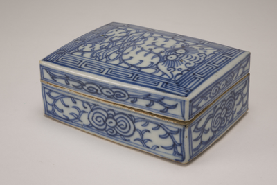 Rechthoekig doosje met deksel. Op het deksel een blauwe meanderband. Hierin blauwe bloemdecoraties. Op de buitenrand van het deksel en rondom op de buitenzijde vaan de doos herhaalde bloemdecors. (Nederlands)