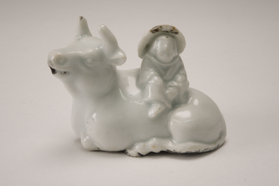 Blanc de Chine beeldje van een liggende koe met daarop een zittend persoon met hoed. Waterdruppelaar.