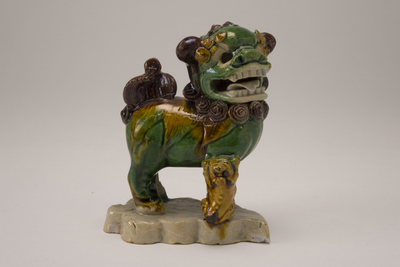 Beeldje van een leeuw op een bladvormige voet in groen, bruin en geel. Ook wel bekend als boedhistische leeuw of Fo-hond. Aan de rechter voorpoot staat een jonge hond. (Nederlands)