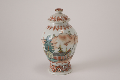 Bol theebusje op versierde voet met Delfts knopdekseltje. Op het deksel, de bovenrand en de voet een roodbruine versiering. Op de bus een landschapdecoratie met huisjes, bomen en visser. (Nederlands)