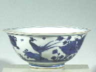 Bowl on footring, spreading sides, bulging upright edge. Decorated in underglaze blue with a continuous landscape with large peony and chrysanthemum sprays, a drifting cloud and two pheasants, one flying, the other perched on a rock. Inside in the centre a branch with a double peach. On the base the six-character mark Chenghua in a double circle. (Engels)
