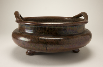 Kwantung wierookbrander met twee oren en op drie pootjes. Op de buitenzijde goud bruin dik koperrood glazuur. (Nederlands)