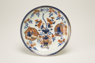 Imari schoteltje met op het plat een vaas met takken en links en rechts een gouden cirkel, Van Diepencollectie, JMD-P-0946 |