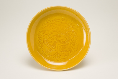Keizerlijk geel ongesigneerd diep schaaltje met op het plat ingekerft onder het glazuur een vijf-tenige draak en een parel, Van Diepencollectie, JMD-P-0951 |