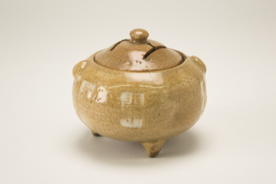 Wierookbrandertje op drie pootjes met knopdeksel. In he deksel zijn twee rechtlijnige gleuven aangebracht. Aan de geglazuurde binnenzijde zijn op de bodem en het deksel donkere verkleuringen te zien. Op de buitenzijde 5 melkwitte chinese tekens of merken onder een doorzichtige glazuurlaag, afgewisseld met 3 aangebrachte deukjes. (Nederlands)