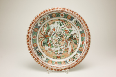 Zes gelijke schotels op voetring, smalle platte rand met kleine lobben in laag reliëf. Famille verte, versierd in verschillende kleuren groen, geel, blauw, aubergine, ijzerrood en zwart email op het glazuur. Midden op het plat een medaillon met een vogel op een tak, kersenbloesem, pijnboom takken en wolken. Tegen het medaillon aan is onder en boven een rotspartij geschilderd met bloeiende planten en bomen. Boven en onder een phoenix, langs de kant golvende vakken met bloemen op een licht ijzerrode grond. De wand met kersenbloesems op een gespikkelde ondergrond, onderbroken door vier gelobde vakken met een bloemtakje gecombineerd met een visje of een garnaal. De kleine lobben van de gemodelleerde rand hebben elk een gestyleerd lotusbloemblad-motief. Op de achterzijde drie bloemtakken. (Nederlands)