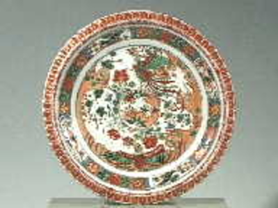 Zes gelijke schotels op voetring, smalle platte rand met kleine lobben in laag reliëf. Famille verte, versierd in verschillende kleuren groen, geel, blauw, aubergine, ijzerrood en zwart email op het glazuur. Midden op het plat een medaillon met een vogel op een tak, kersenbloesem, pijnboom takken en wolken. Tegen het medaillon aan is onder en boven een rotspartij geschilderd met bloeiende planten en bomen. Boven en onder een phoenix, langs de kant golvende vakken met bloemen op een licht ijzerrode grond. De wand met kersenbloesems op een gespikkelde ondergrond, onderbroken door vier gelobde vakken met een bloemtakje gecombineerd met een visje of een garnaal. De kleine lobben van de gemodelleerde rand hebben elk een gestyleerd lotusbloemblad-motief. Op de achterzijde drie bloemtakken. (Nederlands)