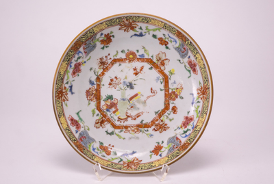 Grof porceleinen schaaltje met gegraveerde gele rand. Op het plat antiquiteiten en een acht-kant met hieromheen bloemen. Op de binnenrand een gele bewerkte band. (Nederlands)