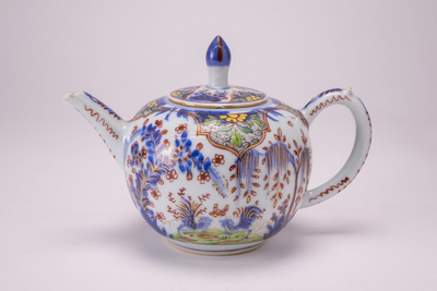 Amsterdams bont (?) theepotje over het blauw gedecoreerd met gele bloemen en vogels en vissen in ijzerrood en groen en goud.
