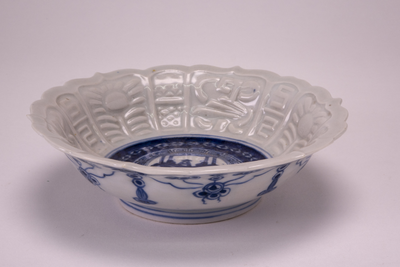 Japans kommetje met gegolfde rand en op de buitenzijde en het plat zijn in blauw decoraties aangebracht. Op de binnenrand zijn in reliëf decoraties aangebracht. (Nederlands)