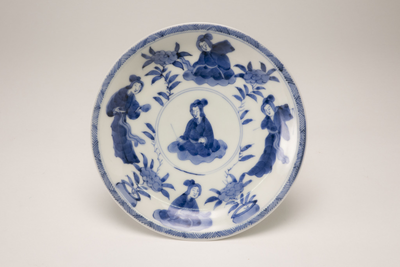 Witte schotel op standring met op het plat in blauw vijf personen en vier bloemen.