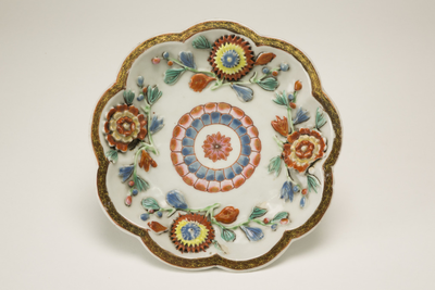 Patti-pan met gelobte rand en op de binnenzijde in reliëf meerkleurige bloemen en blaadjes, Van Diepencollectie, JMD-P-0992 |
