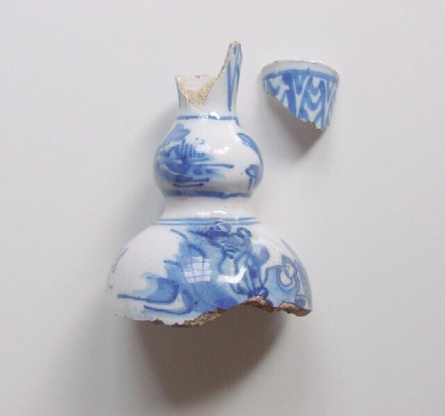 hals: geometrische motieven; buik: landschap met (Chinees?) figuur bolle buik; hals bol, uitlopend in iets uitstaande schacht rechte rand (Nederlands)