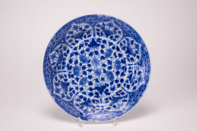 Blauw wit bord met op het plat en de rand zeer drukke bloemdecoraties.Op de rand acht bladvormige velden gevuld met bloemen.